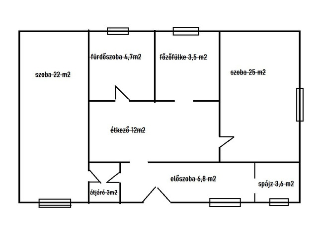 Beim Betreten des Hauses empfängt uns das 6,8 m² große Vorzimmer, von hier aus öffnet sich rechts die 3,6 m² große Speisekammer, links der 3 m² große Flur und das 12 m² große Esszimmer. Das 22 m² große Zimmer öffnet sich vom Foyer aus. Das 5 m2 große Badezimmer, die 4 m2 große Küchenzeile und das 25 m2 große Zimmer öffnen sich vom Esszimmer aus.